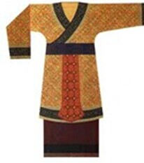 商周贵族服饰 窄袖织纹衣、蔽膝穿戴展示图。这个时期的织物颜色,以暖色为多,尤其以黄红为主,间有棕色和褐色,但并不等于不存在篮、绿等冷色。只是以朱砂和石黄制成的红黄二色,比其他颜色更鲜艳,渗透力也较强,所以经久不变并一直保存至今。经现代科技分析,商周时期的染织方法往往染绘并用,尤其是红、黄等正色,常在织物织好之后,再用画笔添绘。