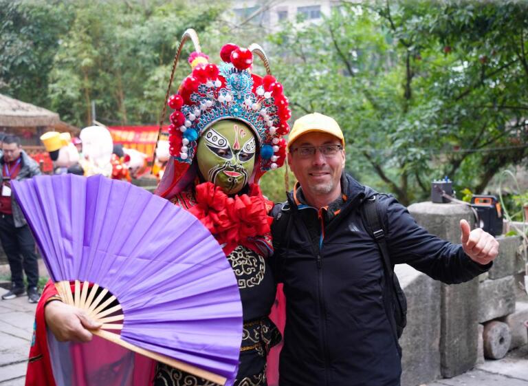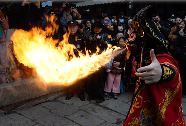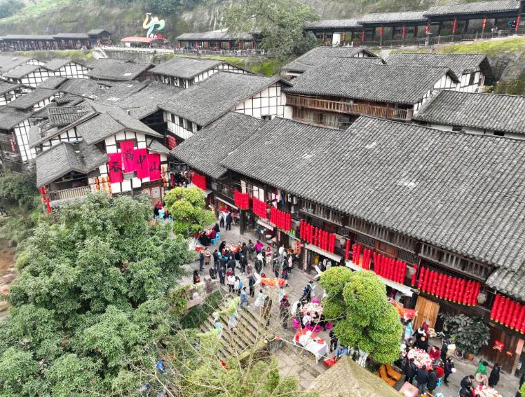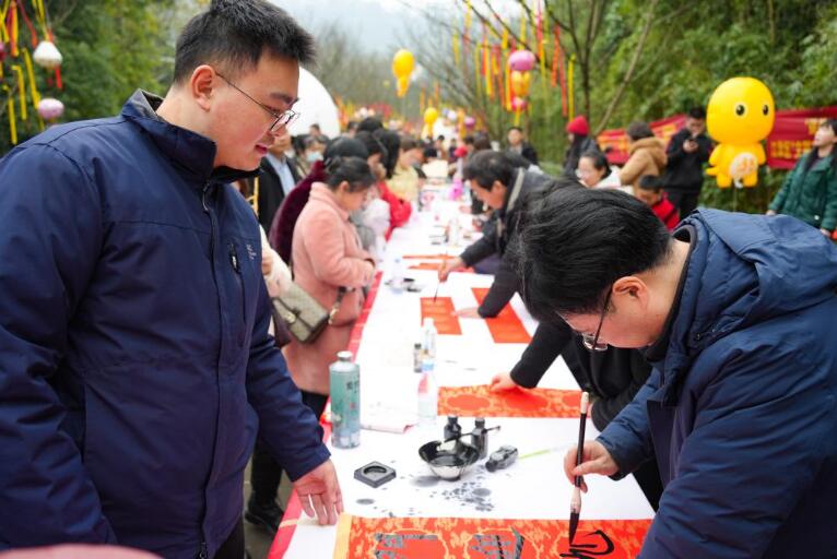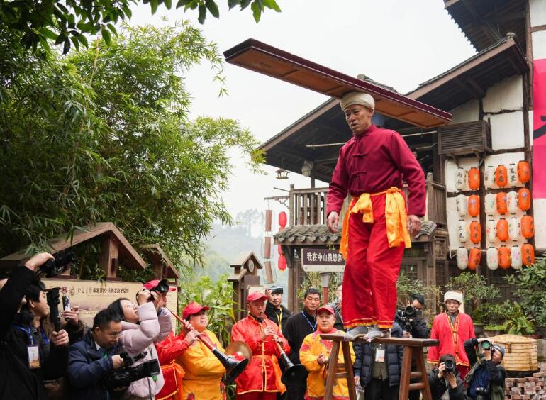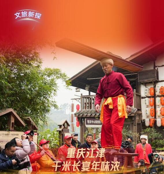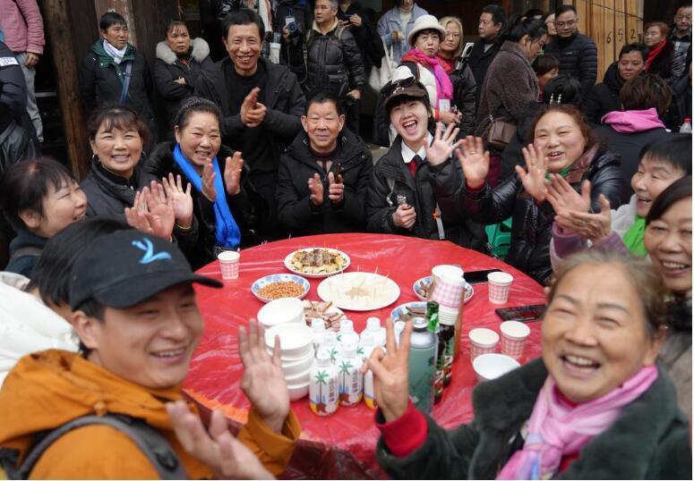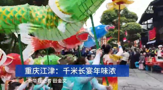 近日,记者亲身体验了重庆江津中山镇千米长宴,撞上了一场热闹非凡、年味浓浓的团圆宴。 天麻麻亮的时候,古镇牌坊前传来阵阵笑声,从牌坊到古镇一公里多的路上,两边树枝上挂满了绚丽的彩带和各式灯笼,浓浓的年味扑面而来。顺着青石板路前行,只见长长的宴席沿着街道蜿蜒,一张张大圆桌整齐排列,场面蔚为壮观。 千米长宴现场。新华社记者 田金文 摄 古镇里,各家各户厨房灯火通明,剁肉、切菜、摆盘,忙得热火朝天。居民丁常财开了一家餐馆,他一边指挥着员工煮汤,一边笑呵呵地说:“我们这个千米长宴特别讲究,猪是才杀的本地土猪,吃起来让人香掉嘴!蔬菜也是刚从地里摘的,水灵着呢。” “千米长宴”是中山镇流传近千年的传统民俗,每逢春节等重大传统节日,古镇居民就沿街设宴,邀请八方来客与本地居民一起品年味、享团圆。 办长桌宴准备的食材。新华社记者 田金文 摄 “真丰盛啊,今天来的客人可有口福了,咱这一直是这么多菜吗?”记者忍不住发问。 忙着摆放桌签的居民阳肆军接过话茬:“哪能呦,虽说这长桌宴年年都在办,但是以前食材有限。现在可不一样喽,家家户户都想把最好的东西拿出来,规模和菜品都是一年比一年丰盛。” 餐馆帮厨陈启辉也忍不住插话:“为了办好长桌宴,我都在网上学了好几招,保管今年菜的味道更好!” 游客等待开宴。新华社记者 田金文 摄 12点整,在传统的祭祀祈福仪式后,千米长宴正式开席,1100多米长的老街顿时香气四溢,人们扶老携幼,喜笑颜开地围坐在桌旁。 “开宴啰!”一道道极具地方特色的美食被端上餐桌,石板糍粑、烟熏豆腐、卤乳鸽、尖椒鸡等菜品摆满了圆桌。正当记者准备享用香气扑鼻的美食时,听到人群里传来一声:“打盆”表演来了,快去看啊。 “什么是打盆?”记者抓住一位居民问道。 居民回答:“‘打盆’是古镇上菜的特色形式,还是非物质文化遗产,可震撼了。” 68岁的杨光祥在表演“打盆”。新华社记者 田金文 摄 记者赶忙放下筷子,挤进人堆。“上菜了!”一声洪亮的号子响彻现场,循声望去,一名身着红衣、脚穿草鞋、头裹白色头巾的男子登场。只见他脱手顶着一张长约2米、宽20公分的木托盘,10多盘热菜整齐地摆放在托盘中,踩上了方桌上的凳子。 “这叫打盆登高,亮的就是绝活。”一旁的居民说道。 男子站在高台上,双手挥舞方巾表演了一番后,走下台子,将菜稳稳当当送到席间。 “我叫杨光祥,今年68岁了,20多岁就学‘打盆’,祝你们吃好喝好。”杨光祥说,仅“打盆”的托盘就7公斤重。 “那您累吗?” “不算累,我干习惯了,累不累要看朋友对不对味,对的话我还能再端几年。”言罢,杨光祥哈哈大笑。 菜不断上桌,席间的人们也一边大快朵颐,一边唠着家常。“今年收入还行吧?”“孩子工作顺不顺心呐?” 一句句亲切的问候,拉近了彼此的距离。孩子们在桌子间嬉笑奔跑,高兴劲儿都快从眼睛里溢出来了。 当天,非遗鲤鱼灯、舞龙舞狮、杂耍、川剧变脸吐火、状元巡街等10余项江津非遗项目接连上演,现场氛围热烈。新春楹联送福、非遗版画体验等活动,更是让八方游客流连忘返。 游客在活动现场体验多种非遗和写对联。新华社记者 田金文 摄 只见川剧变脸大师气宇轩昂地走上台,眼神锐利,手在脸上轻轻一抹,一张脸谱“嗖”地一下,如闪电般迅速变换成另一张;非遗绝技川剧喷火更是点燃了现场,脸部涂满油彩、身着华服的演员,手中握着特制道具,深吸一口气,胸膛高高隆起,猛地向前倾身,头部快速摆动,同时嘴巴用力一喷,刹那间,一道足有丈余的火焰喷射而出,将空气烧出“呼呼”的声响。 现场气氛瞬间“轰”地一下炸开,欢笑声、喝彩声此起彼伏。 震撼的喷火表演。新华社记者 田金文 摄 “吃得太好了,表演也震撼,今天真是让我大开眼界。”来自捷克的王杰说,他特别喜欢中国传统文化,在现场感受到了喜气和热闹。 捷克游客王杰(右二)和川剧演员合影。新华社记者 田金文 摄 据介绍,当天古镇准备了460余桌特色宴,3万余名游客齐聚,逛老街、赏非遗、品美食、忆乡愁,沉浸式体验传统民俗盛宴的魅力。 千米长桌宴还将持续一段时间。在这个新春,千米长宴用它独特的方式传递着温暖与喜悦,也让人们在忙碌的生活中,停下脚步,感受传统民俗的魅力。