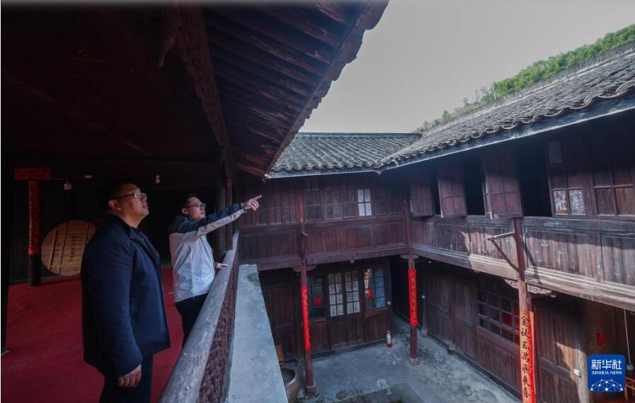 4月1日,岭北镇文化特派员、浙江工业职业技术学院的讲师李亚(右)与岭北镇党委委员楼炳在高台门古建筑群里查看古建筑的维保现状。