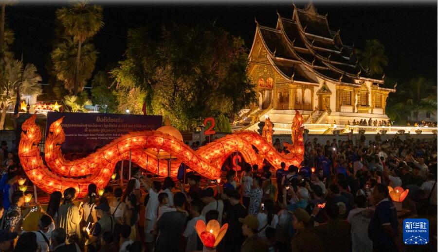 10月8日,老挝琅勃拉邦庆祝传统节日——灯船节。当晚,老挝琅勃拉邦的街头灯光闪烁,人们穿着传统服装参加灯船游行,将灯船放入湄公河中,祈求来年风调雨顺、幸福安康。