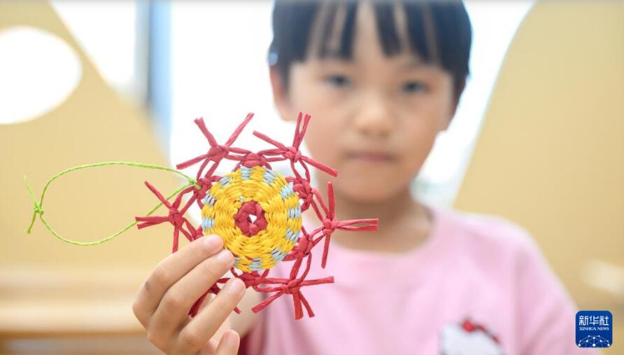 10月12日,在海南省文化馆,小朋友展示自己的东山草编技艺作品。