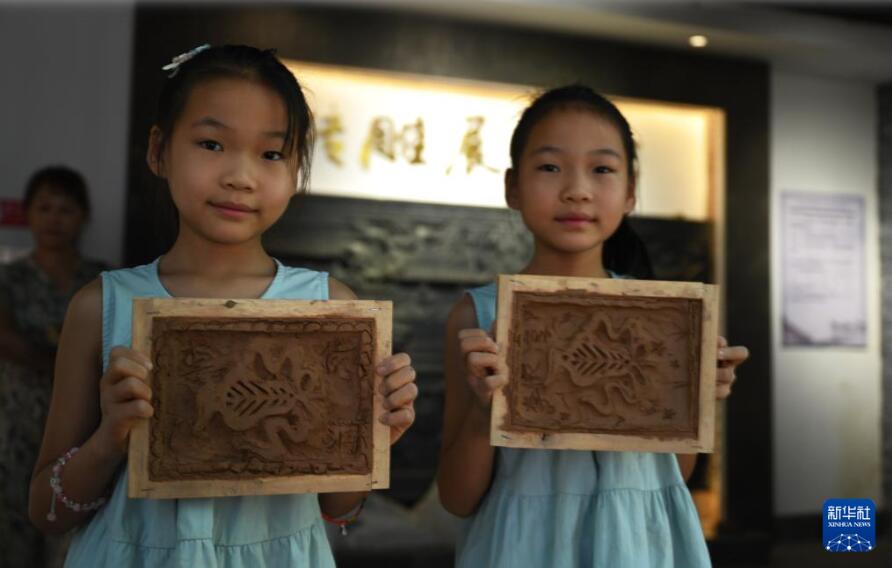 10月12日,参加研学活动的小朋友在寺平村砖雕展示馆内展示自己制作的砖雕作品。