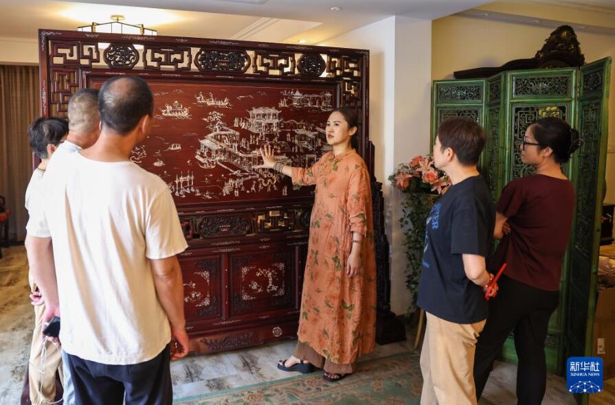 10月15日,胡蓉(右三)在孔浦街道怡江社区的非遗工作室为居民介绍骨木镶嵌技艺。