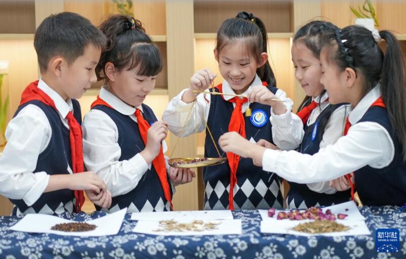 10月22日,在江苏省泰州市姜堰区实验小学教育集团北街北校区,学生体验称量中草药。