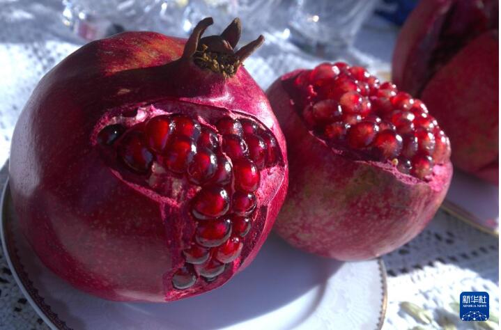 这是11月9日在阿塞拜疆盖奥克恰伊区举办的石榴节上拍摄的石榴。 石榴节是阿塞拜疆中部盖奥克恰伊区为庆祝石榴丰收举办的庆典活动,2020年被列入联合国教科文组织人类非物质文化遗产代表作名录。 新华社记者 陈俊锋 摄