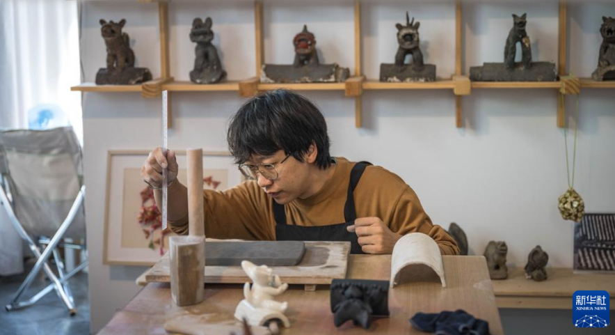 捧起泥土,反复搓揉、捶打;竹刀轻走,刻出须纹与爪印;阴干定型,入窑烧制;过程中全无图纸,也无模样,仅凭心中的所想。工作间内,张航尝试调整瓦猫姿态、改变头身比例,思索在旧工艺上创造新表达。“瓦猫的肚腩要留空,口尾相通,保留‘吞进不好的、排出有益的’寓意,让新瓦猫依然肩负传统的使命。”