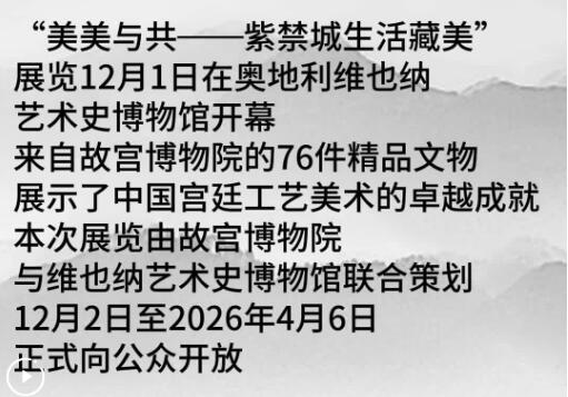 “美美与共——紫禁城生活藏美”展览12月1日在奥地利维也纳艺术史博物馆开幕,来自故宫博物院的76件精品文物展示了中国宫廷工艺美术的卓越成就。 本次展览由故宫博物院与维也纳艺术史博物馆联合策划,12月2日至2026年4月6日正式向公众开放。 新华社音视频部制作
