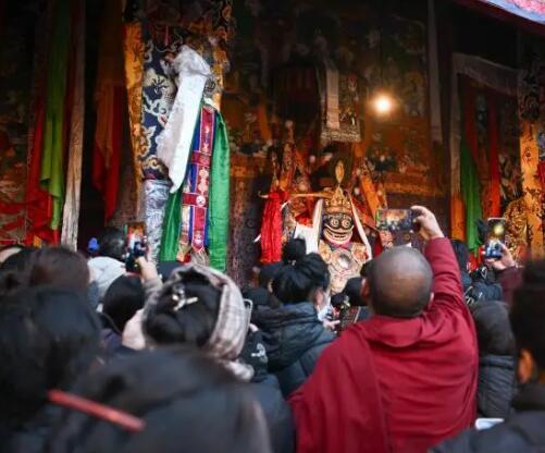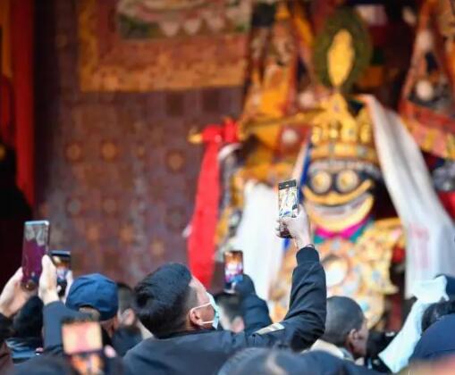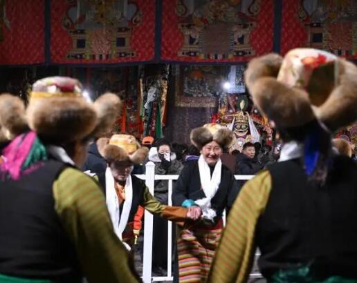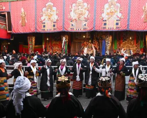 图为身着民族服装的信众在大昭寺内载歌载舞。中新社记者 贡嘎来松 摄