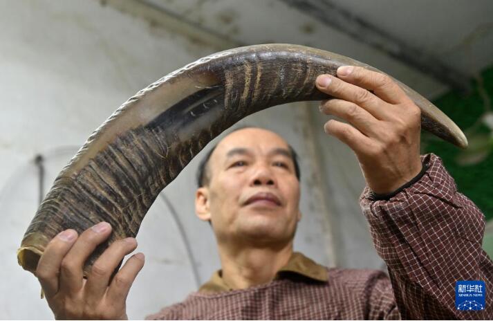 12月16日,宾阳武陵牛角制品制作技艺传承人叶华良在武陵镇叶角匠梳艺馆挑选准备加工的牛角。