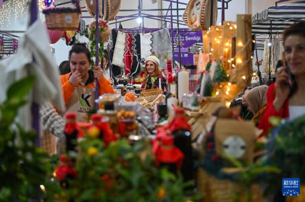 随着新年临近,土耳其伊斯坦布尔加拉塔港的钟楼广场搭建好帐篷举办新年购物节,售卖与节日相关的商品。