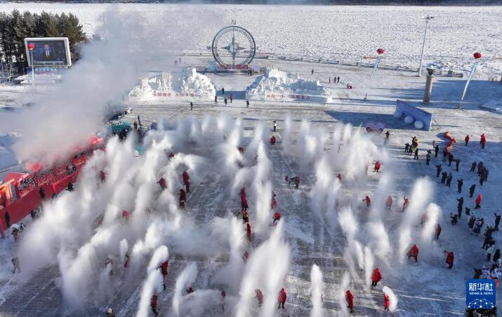 12月21日在北极村七星广场拍摄的“泼水成冰”表演(无人机照片)。