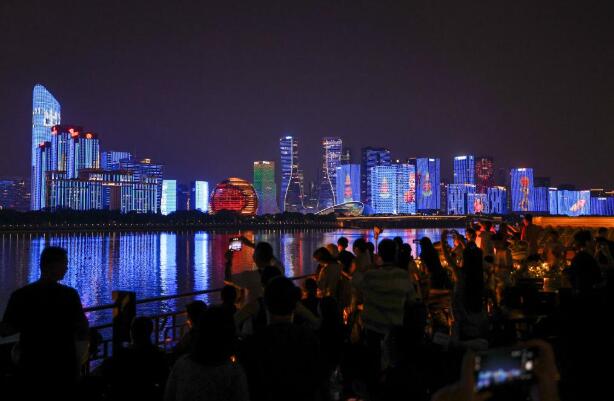 10月2日,游客在观赏杭州钱塘江沿岸夜景。新华社记者江汉 摄