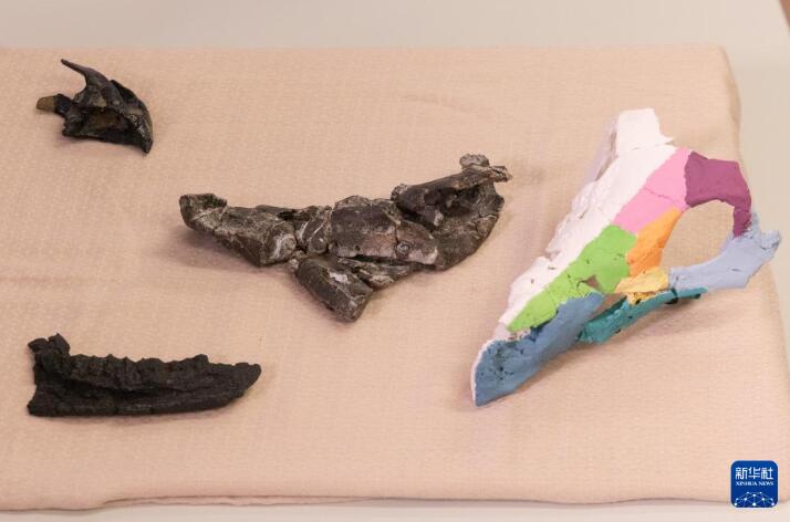 这是1月7日在匈牙利布达佩斯洛兰大学举行的新闻发布会上拍摄的科兹玛奥伊考角龙头骨化石及其3D复制模型。 匈牙利洛兰大学在7日举行的新闻发布会上宣布,迄今为止,在匈牙利发现的一具角龙类恐龙头骨化石是表明角龙类恐龙在白垩纪晚期生活于欧洲的最有力证据。这具化石被鉴定为科兹玛奥伊考角龙化石,出土于匈牙利包科尼山的伊豪尔库特化石遗址。 新华社发(弗尔季·奥蒂洛摄)