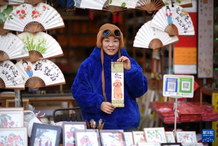 1月9日,画师陈丽华在西安书院门历史文化街区展示自己绘制的宠物狗画像。