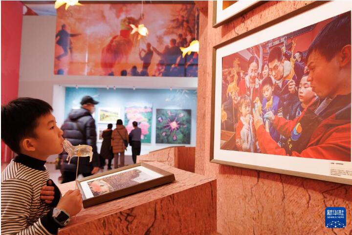 1月26日,在中国非物质文化遗产馆举行的展览现场,小朋友被一幅摄影作品吸引。