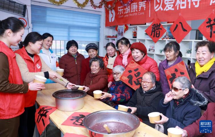 1月25日,在湖北省武汉市黄鹤楼街道读书社区老年人活动中心,老年人品尝腊八粥。