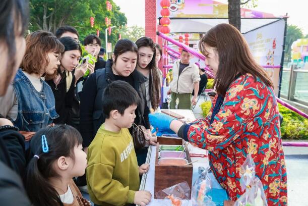 1月26日,由文化和旅游部非物质文化遗产司、广东省文化和旅游厅等共同主办的2026年“非遗贺新春·寻味中国年”主题推广暨非遗年货购物月“广货行天下,美食在广东”主场活动在广州举办。 花城广场上,英歌舞赢得观众阵阵喝彩,非遗市集引人驻足。本次活动设置“寻味中国年”“华衣焕新颜”“国风潮好物”展区,来自15个省区市及香港、澳门的130余个非遗代表性项目在此展销。 “慢慢吹,我来给你捏一个小猪。”在香港非物质文化遗产办事处的展位前,香港吹糖人师傅薛锦屏一边为游客介绍吹糖人的历史,一边用糖料捏成各种生动造型。“我很喜欢这次活动的氛围,除了让大家体验吹糖工艺,我也有机会去接触全国各地的非遗项目,和其他传承人相互交流。”薛锦屏说。 1月26日,广州非遗市集上,香港吹糖人师傅薛锦屏在指导小朋友吹糖人。(受访单位供图) “请帮我写一个‘马’字”“我想要‘招财进宝’。”在天河书画院的展位,几位书画老师挥毫不停。“一天下来,数不清写了多少幅了,但能把‘福’字和祝福送给大家,心里很高兴。”天河书画院执行秘书长陈琼霓说。 非遗年货购物月将持续至3月3日。在此期间,各地将推出一批非遗好物、旅游线路和体验服务,丰富春节期间优质文化产品供给,推动非遗成为创新消费场景、激发消费活力的新热点新动能。 本次购物月还邀请非遗传承人走进直播间,讲述非遗保护与传承的故事。由中央网信办网络传播局、文化和旅游部非物质文化遗产司主办的“非遗贺新春·我的家乡年味浓”视频直播活动也将同步开展。 同期,广东省文化和旅游厅在全省举办“广货行天下,美食在广东”系列活动。