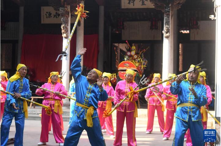 2月4日,在安华镇丰江周村的宗祠,参加联合展演的村民在排练响叉。