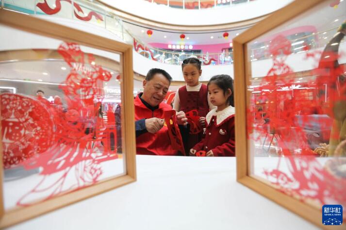 2月4日,剪纸手艺人在甘肃省定西市一商场教小朋友剪纸技艺。