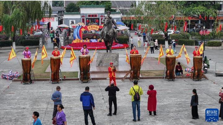 2月22日,在广西钦州市刘永福广场,民间艺人在表演烟墩大鼓(无人机照片)。 春节期间,在广西钦州市刘永福广场,轮番展演的新春采茶戏和烟墩大鼓“击鼓迎春”等活动,让传统文化的韵味飘香,丰富了群众的春节文化生活。 新华社记者 张爱林 摄