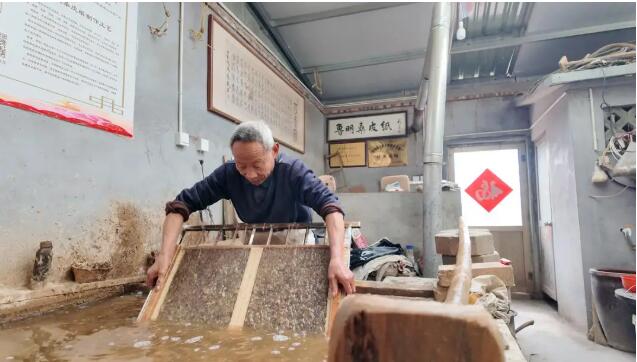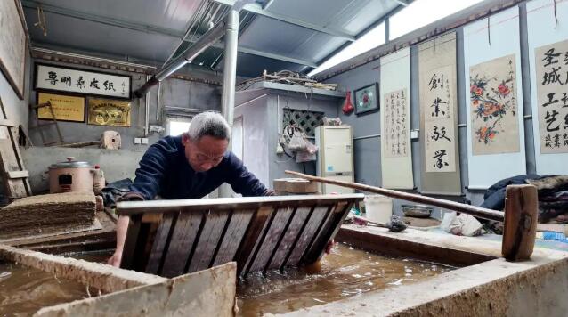 桑皮纸制作技艺,承载着曲阜纸坊村千年造纸文脉,历经72道纯手工古法工序淬炼而成。代表性传承人郑友明四十七载匠心深耕,深谙捞纸、叠纸等独门技艺精髓;在传统技艺式微的当下,他守正创新,改良研发出多款书画专用桑皮纸,让老手艺适配现代需求、实现供不应求。如今他最大的心愿,便是盼年轻人接力传承,让这门古法技艺永续流传。 方寸抄纸房,藏着千年技艺 3月6日,走进省级非遗桑皮纸制作技艺代表性传承人郑友明的“抄纸房”,一股沉淀千年的古韵便扑面而来。在这间不过十余平方米的老作坊里,木架、竹帘、石槽错落摆放,空气中弥漫着桑树皮特有的清润草木香,时光仿佛在这里慢了下来。屋子正中,一口长方形水槽静静卧着,槽内是经多道工序细细调制的纸浆,乳白中泛着浅黄,细腻均匀。伴随着转轴轻轻摩擦的低响,郑友明沉气凝神,一双常年与纸浆、竹帘打交道的粗壮大手,此刻却格外灵巧。他稳稳托起竹帘,探入浆池,手腕轻旋、力道匀停,先是一沉一抬,再是左右轻荡,反复数次,薄如蝉翼的纸膜便稳稳附着在竹帘之上,一张桑皮纸的雏形就此初成。整套动作行云流水,一气呵成,尽显数十年练就的纯熟功力。 “桑皮纸讲究一滑一麻,两面纹理截然不同。”郑友明一边轻轻揭起刚抄好的湿纸,一边细心讲解,“紧贴竹帘的这面光滑细腻,我们叫它滑面;朝上自然成型的这一面纤维纹理更明显,叫作麻面。叠纸时,必须每张滑面朝上,与下一张的麻面相贴,这样一滑一麻、错落相叠,纸张之间才能透气好分离。要是滑面对滑面、麻面对麻面,湿纸就很容易粘连破损,前功尽弃。” 在桑皮纸制作技艺里,这道看似简单的叠纸规矩,藏着古法技艺传下的实用智慧。而真正考验匠人的,正是郑友明口中的“捞纸”—— 这是整个技艺中最核心、最吃功夫的一环。纸的厚薄、匀度、细腻度与整体品相,没有机器校准,全凭匠人一双手、一双眼、多年手感来把控。手腕起落的轻重、竹帘入浆的深浅、摆动的幅度与速度,差之毫厘,纸质便谬以千里。想要捞出张张均匀、薄厚如一的好纸,绝非一日之功,必须经过日复一日、成千上万次的反复锤炼,才能让手艺融入筋骨,心手合一。 七十二道工序,承载千年文脉 “桑树浑身都是宝,老辈人常说:桑叶能养蚕,桑根可入药,桑树皮,就是我们做桑皮纸的金贵原料。” 说起这门老手艺,郑友明如数家珍。桑皮纸制作技艺中,从头到尾只取桑树皮为原料,不掺半点杂料。从一根带着露水的新鲜桑条,到一张柔韧如玉的桑皮纸,中间有着足足72道古法工序,一环扣一环,容不得半点马虎。整套流程走下来,前后需要两个多月的时间。“这活儿苦,也慢。” 郑友明轻轻抚摸着手中已经软化的桑皮,语气朴实而坚定,“泡皮的时候,人经常在水里一泡就是一整天;打浆、抄纸、揭纸、晒纸,一步都不能急。就算从早忙到晚,一天忙活十几个小时,一个人也只能做出五六刀纸。” 桑皮纸古称“汉皮纸”,是曲阜市王庄镇纸坊村传承千年的“老手艺”,也是中国古法造纸的 “活化石”。这项技艺始于汉代,历经唐宋传承、明清兴盛,《阙里志》中便有“纸坊在城北十里,居人造纸为业”的记载。数百年来,纸坊村村民世代以造纸为业,坚守着从选料、浸泡、蒸煮、碾压、打浆,到抄纸、压榨、晾晒、焙干等古法工序,不掺化工、不借机械,以纯手工守护着这份古老技艺。 如今,在纸坊村,依旧坚守着手工桑皮纸这门老手艺的人家,已经寥寥无几,郑友明一家,便是为数不多的坚守者。“从我爷爷那一辈,家里就开始做桑皮纸,传到我这儿,已是第三代了。”郑友明望着手中的竹帘,眼神里满是岁月沉淀的感慨,“我十几岁就跟在父亲身边打下手、当学徒,搬料、泡皮、打杂,一点点学、一点点练,这一晃,已经47年了。”他说,在过去的漫长岁月里,桑皮纸可不是简单的书写用纸,而是村民生产生活里离不开的“实用纸”:酿酒时用来封坛、糊制条编器皿、加固农用工具、包裹器物、裱糊门窗……用途广泛、实用性极强。 数番技艺革新,拓出书画新途 面对老手艺日渐式微的困境,郑友明没有固守传统、原地等待,而是主动求变,在坚守古法精髓的基础上,对桑皮纸制作工艺进行了一次次摸索与改良,成功走出了一条非遗技艺与现代审美相结合的新路子。 他在传统桑皮纸的基础上反复调试纸浆配比、抄制手法与晾晒工艺,专门研发出适用于书画创作的精品桑皮纸。这种纸质地柔软绵密、韧性十足、纤维细腻均匀,色泽温润呈天然淡黄色,落笔不洇墨、着色沉稳,自带古朴典雅的文人气息,能让书画作品更显厚重生动,一经推出便深受各地书画爱好者、书画家的青睐。 “以前传统纸张尺寸比较固定,在28厘米×42厘米左右,满足不了书法绘画的需求。”郑友明解释道。为适配不同书画创作场景,他大胆改造抄纸竹帘、模具等传统工具,经过反复试验,成功研制出50厘米×50厘米、50厘米×120厘米等10多种规格的创作专用桑皮纸,还可以根据客户需求量身定制,彻底打破了传统桑皮纸在尺寸与用途上的局限。 如今,郑友明手工制作的书画桑皮纸,年销量已达到5万多张。可他却笑着说:“别看这个数字不大,每一张都是纯手工抄制、纯古法晾晒,不是我们不想多卖,是我们一年到头全力赶制,也只能做出这么多,常常是订单排着队,供不应求。” 销路打开了,名气传开了,但郑友明心里最牵挂的,依然是手艺