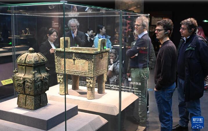 4月2日,参加中意文化遗产保护修复国际圆桌会议的意方专家在位于北京的中国考古博物馆参观馆藏文物。