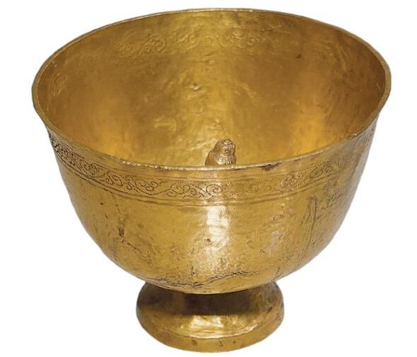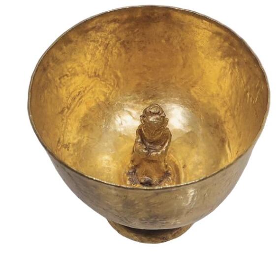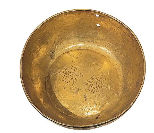 平底金杯一只,杯柄已脱落。金杯外壁口沿下方錾一周水波纹,内底錾双鱼(图5)。外底近缘处錾一个“寄”字。