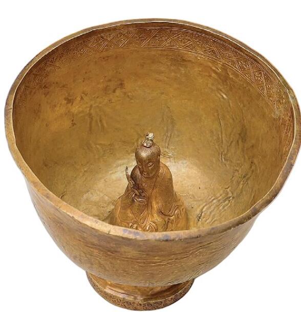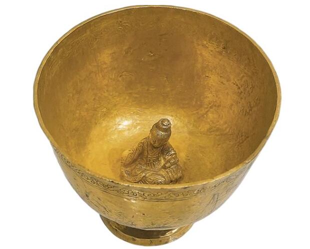 金盏两只,尺寸与重量大致相当,盏心均接焊用片材打制的一身人像。其一,外壁口沿下方錾双线边框,边框内锥点缠枝卷草,盏心人像头顶束髻裹帕,内穿交领衫,下系裙,外覆道袍,右手敛袖背后,左手握持书卷,盘膝坐在中央2(图4-1)。片材打作喇叭式圈足,圈足的底沿折边下覆,足沿上錾“岫”字款。另一件, 外壁口沿同样锥点缠枝卷草,但颇粗疏,盏心人像的打制也未如前件之精,大致可辨是幅巾拱手立于花台的一位老者(图4-2)。