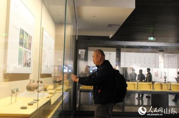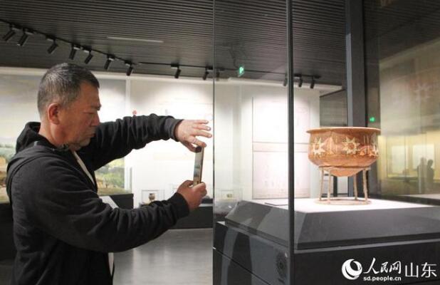一位游客在拍摄“八角星彩陶豆”。人民网记者 宋翠摄