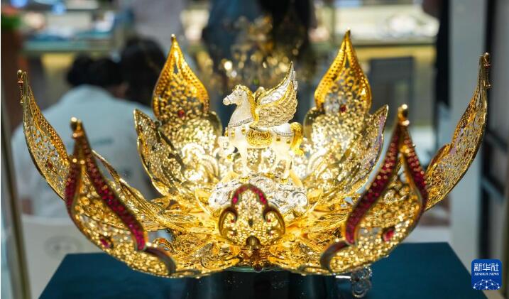 这是4月15日在第六届消博会上拍摄的老凤祥展出的鎏金骐翼·莲鸣八音盒。
