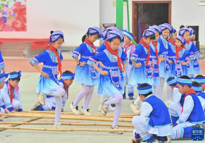 4月15日,广西梧州市长洲区龙平小学举行“石榴花开一家亲 同心喜迎‘三月三’”主题活动,师生们通过唱山歌、跳竹竿舞等丰富多彩的活动,喜迎传统节日“三月三”。