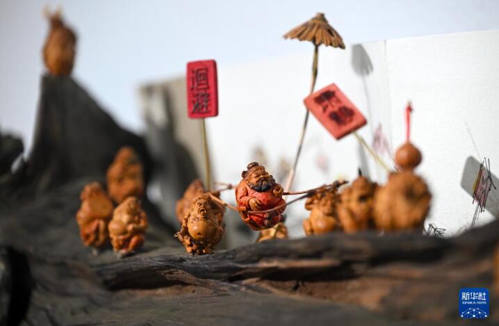 这是展出的残疾人核雕作品《钟馗夜巡》(4月16日摄)。