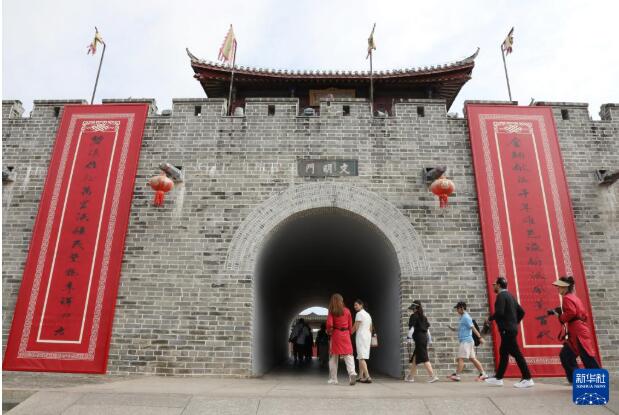 4月25日,游客在三亚市崖州区崖城村参观“文明门”。