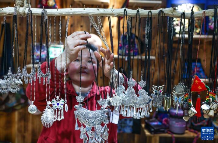 4月21日,贵州省黎平县肇兴侗寨的商户在整理销售的银饰文创产品。