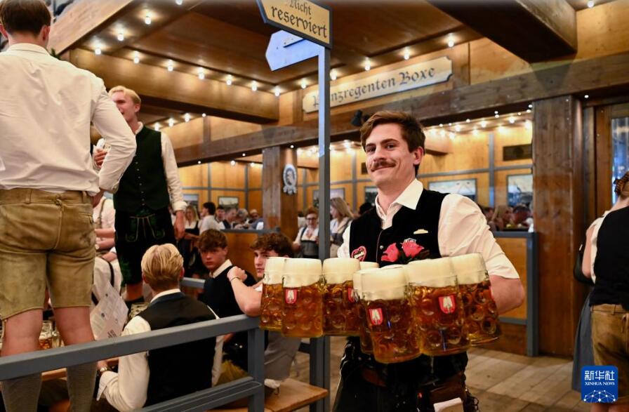 9月20日,工作人员在德国慕尼黑啤酒节现场运送啤酒。 当日,第190届慕尼黑啤酒节开幕。慕尼黑啤酒节始于1810年,已成为德国最著名的民俗节庆活动之一。 新华社记者 张豪夫 摄
