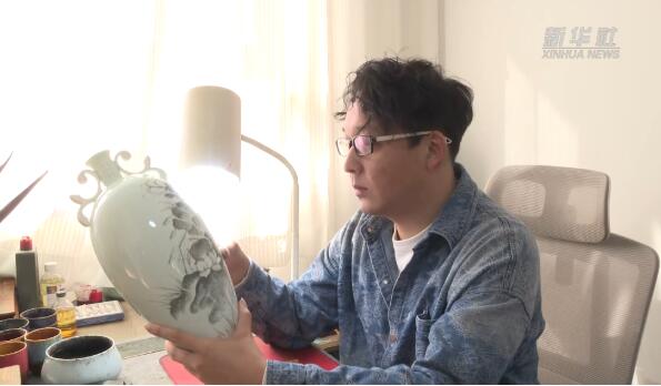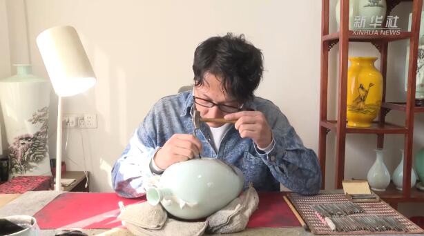 在山东省淄博市淄川区的津丞艺术工作室,刘津丞正手持刻刀和小锤在一件双耳如意瓶上创作。清脆的敲击声中,一幅荷塘游鱼图逐渐呈现在瓶身上。1994年出生的刘津丞是淄博刻瓷技艺传承人。19岁那年,他拜刻瓷大师李秋峰为师,开始系统学习刻瓷技艺,并将学校里所学的油画知识融入到日常创作中。